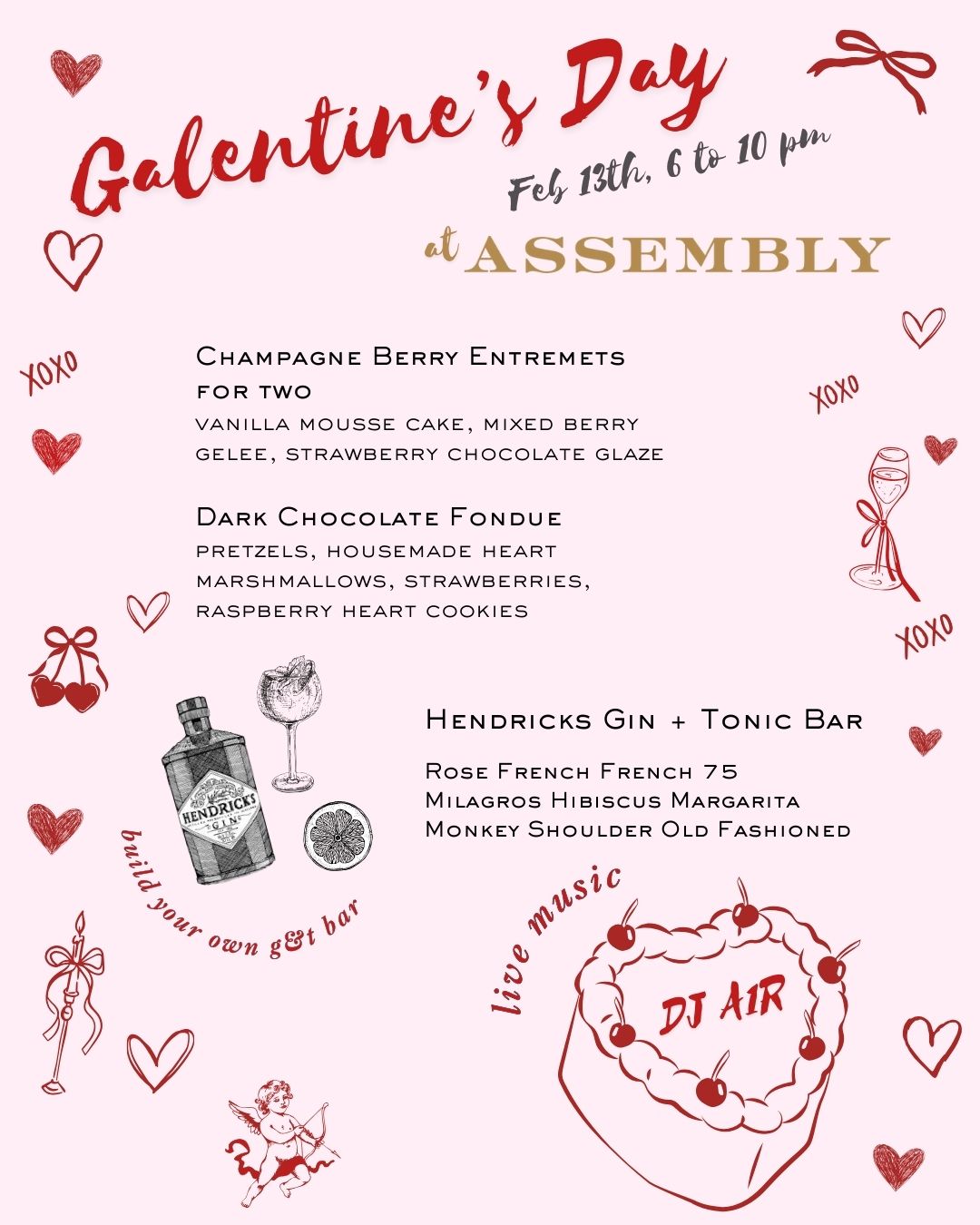 Thursday, February 13th - Galentine's Night: Grab your besties and celebrate friendship with themed cocktails, build your own Hendrick's Gin and Tonic bar, delectable and demure desserts and music from DJ A1R!