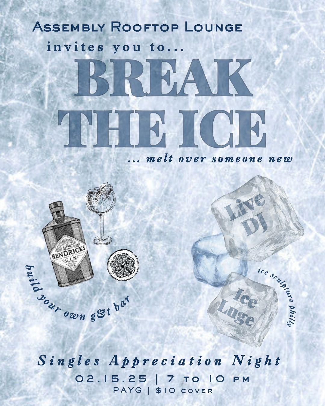 Saturday, February 15th - "Break the Ice" Singles Night: No date? No problem! Come to Assembly for a night of fun, flirty vibes, and cool connections. Our Ice Luge from Ice Scultpure Philly will keep the drinks flowing while the sparks fly and DJ Dave McCann will be spinning good vibes and setting the mood. $10 cover at the door.