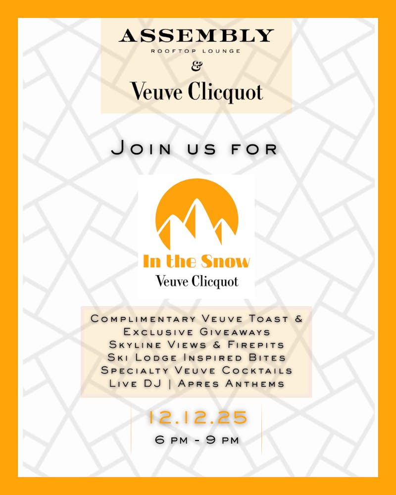On Friday, December 12th, 6 - 9 pm, slip away to our wintery rooftop oasis as Assembly Rooftop Lounge and Veuve Clicquot bring you an unforgettable night wrapped in champagne sparkle. Take in sweeping skyline views, get cozy by our glowing firepits, and settle into the season’s chicest celebration.