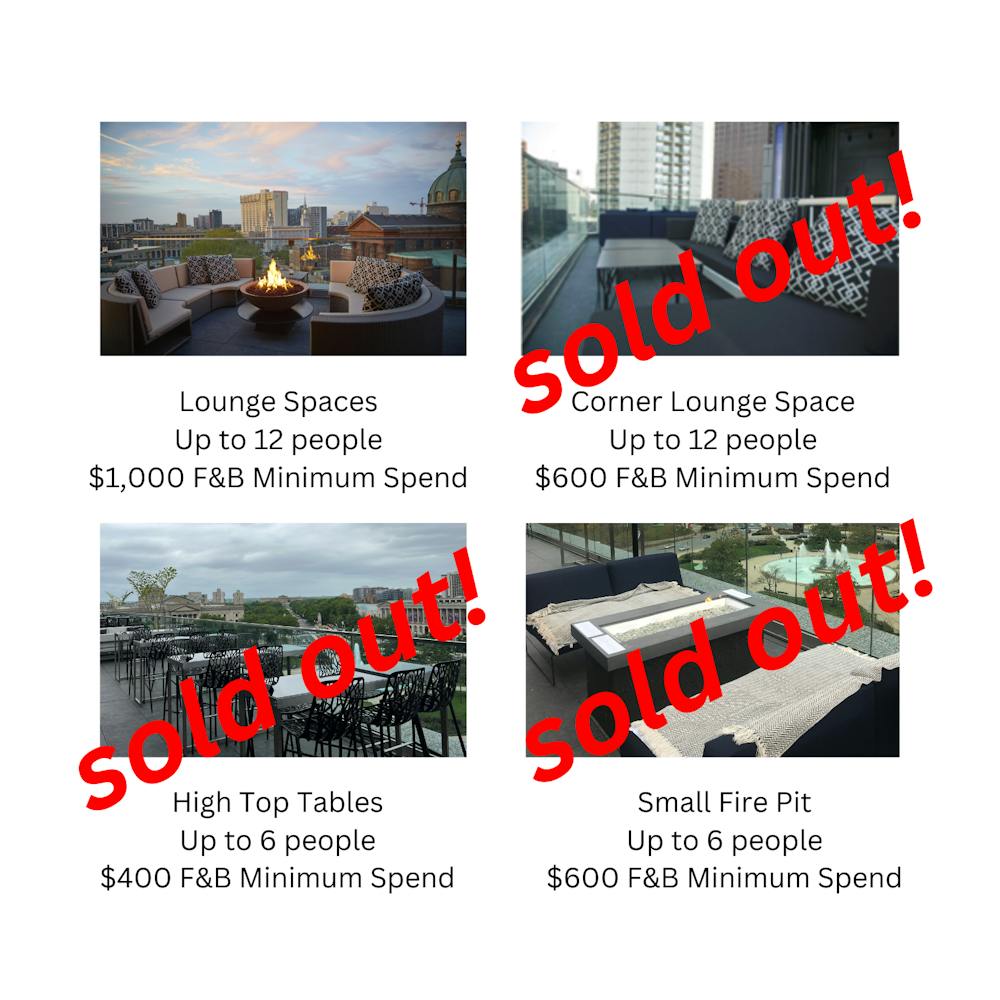 - High Top Tables for up to 6 people each - $400 Food and Beverage Minimum ++